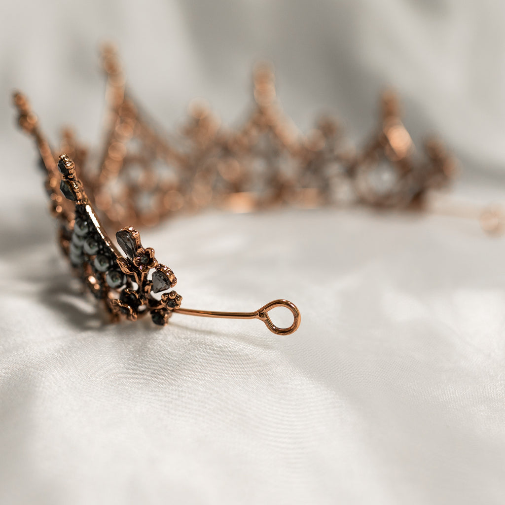 Crafted in warm rose gold with smoky gray crystals and pearls, this ornate crown features pointed arches, floral metalwork, and intricate filigree details that capture the light from every angle.
